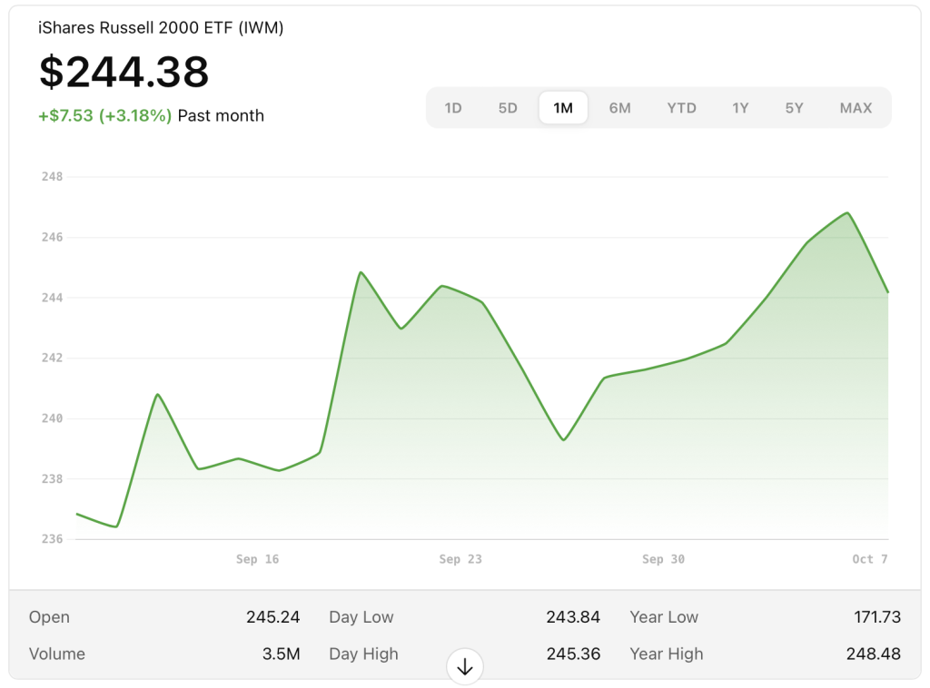 Wall Street is trading with a sense of cautious optimism. The SPDR S&P 500 ETF (SPY) is up modestly, and the iShares Russell 2000 ETF (IWM) — a proxy for small- to mid-cap stocks — is also inching higher.