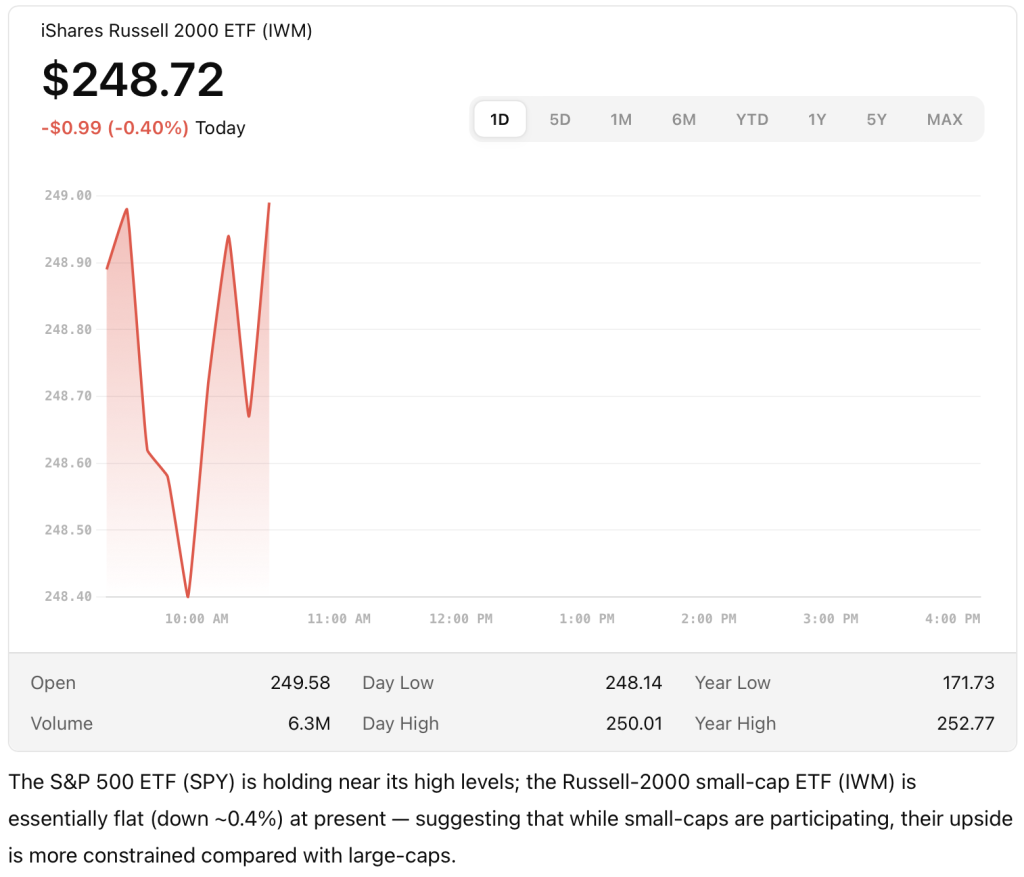 Often when the large-cap part of the market is thriving, small caps either lead (in risk-on surges) or lag (when risk becomes more selective). Here’s how the small-cap sector is behaving today, and what to watch: