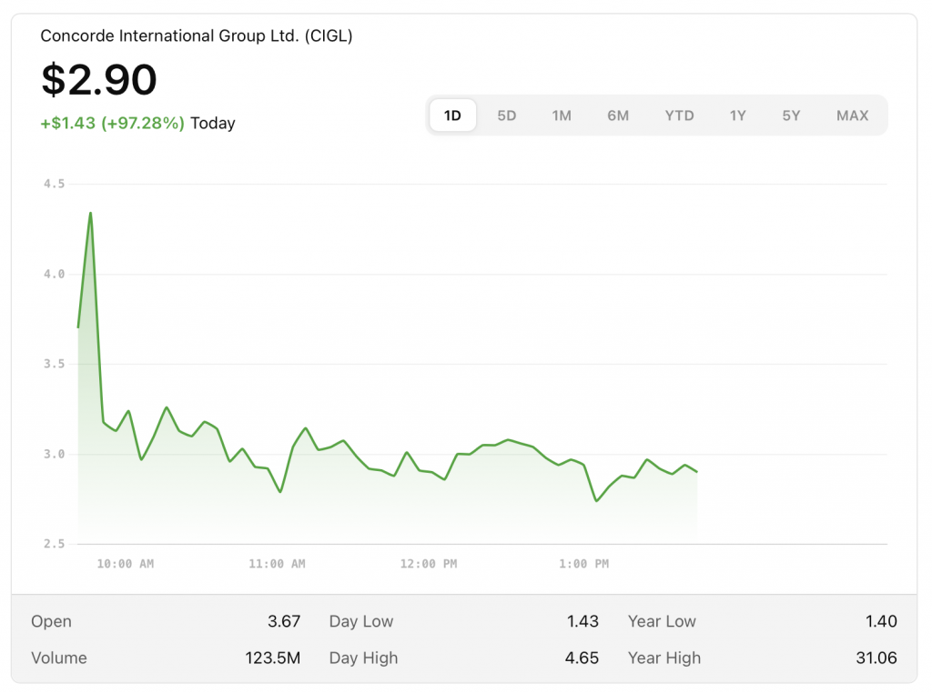 Concorde International Group Ltd. (NASDAQ: CIGL) surged nearly 100% intraday, rallying from USD 1.47 to a peak of USD 4.74, before settling near USD 2.90—its current price as of this afternoon. Trading volume exploded, eclipsing 123 million shares, far beyond its typical float.